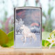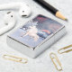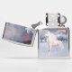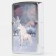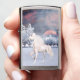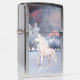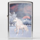 Mooie witte eenhoorn op een sneeuwachtergrond met een zonsopgang of zonsondergang die hem een magische of mysterieuze fantasievloeistof geeft Zippo lichter