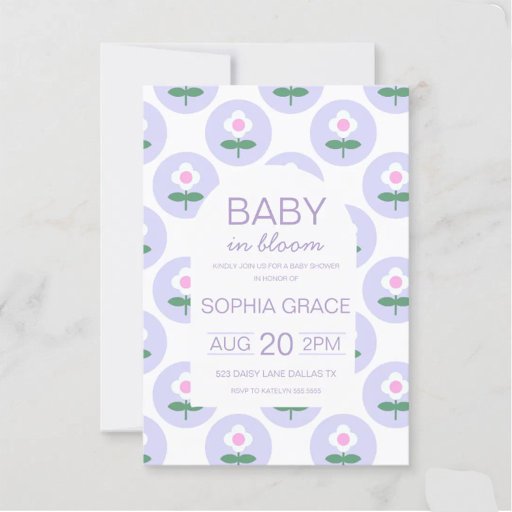 Uitnodiging voor baby shower met magneet Cute paarse roze madeliefjes bloem, geïllustreerd door internationale ontwerpster, Kathrin Legg