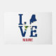 Maine staat liefde. Hoofd in helder rood in hoofdletters sans doopvont. Het woord liefde is gevuld met de staatsvlag en de letter O in liefde is gevormd in het silhouet van de staat Maine.