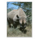 Een regale foto van een prachtige neushoorn die recht naar de camera kijkt.