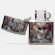 This oil painting by Amanda Diehl features an intricate Venetian mask with elaborate gold and silver details adorning the playful, curly fins of the joker's hat and collar. The mask smiles gaily against a red velvet backdrop.