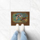 Mannelijke en vrouwen wilde eenden vliegen over een goudvijver, water rimpelt om de kleuren van het najaarsgebladerte op de achtergrond te weerspiegelen dat gloeit in het zonlicht, allemaal op een aardebruine achtergrond.