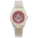 Stijlvol zilveren vierkant en compass Masonic-symbool met gemandateerd, gepersonaliseerd horloge op de achtergrond.