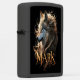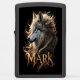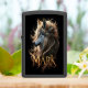 Een majestueuze wolf met een vloeiende manen kijkt naar de zijkant, zijn gouden ogen doorboren de duisternis. Het woord Mark is hieronder in elegant schrift geschreven, omgeven door bloei.
