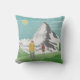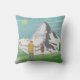 Een vectorachtige illustratie van de Matterhorn in Zwitserland. Dit is het uiterlijk van een retro reisposter. Wandelaars die richting de bergen lopen, is in de verte een kabelbaan te zien.