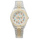 Dit mannen horloge heeft een middeleeuws modern ontwerp van concentrische cirkels in goud, sinaasappel en turquoise op een witte achtergrond.