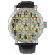 Dit mannen horloge heeft een modern ontwerp uit het midden van de eeuw van halvemaanmanen horizontaal verdeeld in drie kleuren, roze, blauw, lavendel of seafoam, verdeeld in twee en verspreid op een rooster met een gele achtergrond. Als je het ontwerp leuk vindt, maar verschillende kleuren wilt, stuur me dan een bericht.