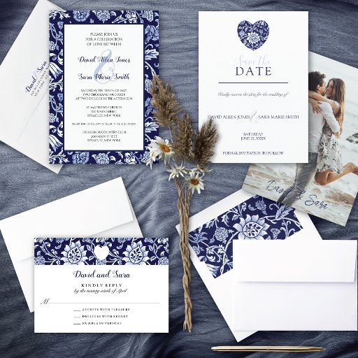 A floral wedding invitation with a pattern of meadow wildflowers in indigo blue. The meadow wildflowers create a delightful border, their natural beauty framing the text, which adds a touch of sophistication to the design. The result is an invitation that perfectly balances the rustic charm of the countryside with a touch of timeless elegance. A decorative script font is used for the couple's names with an ampersand in between.