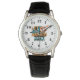 This men's classic leather strap watch is shown in black with a sporty basketball art print.