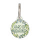 This pet ID tag features the slogan 'Hard of Hearing', surrounded by a green wreath of eucalyptus leaves, on a pale green background. You can edit the text as needed. Can be used for pets or humans, as a necklace, keyring, etc.⭐ For more deafness accessories, visit my store Zazzle.com/Elder_Vitality ⭐ For custom orders, message me on Zazzle