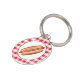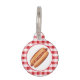 L'illustration de restauration rapide de Destei représentant un pain à hot dog avec une saucisse grillée qui a du ketchup et de la moutarde sur le dessus. Le fond est à carreaux rouges. De l'autre côté, il y a deux zones de texte personnalisables, l'une idéale pour le nom de l'animal, l'autre pouvant être utilisée pour le numéro de téléphone du propriétaire.