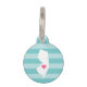 Laissez votre ami furry montrer une certaine fierté de l'état de la maison avec cette mignonne étiquette d'identification de animal de compagnie du New Jersey. Design présente une carte en silhouette blanche de l'état du New Jersey avec un coeur rose à l'intérieur, sur un ton sur ton bleu turquoise arrière - plan rayé. Ajoutez le nom et les coordonnées de votre animal à l'arrière en lettres blanches sur un arrière - plan aqua.