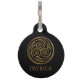 Dramatique noir et or complexe triple noeud celtique tourbillonne mandala. Des spirales éternelles et des noeuds de trinité en or sur un arrière - plan noir. Personnalisé avec le nom de votre animal de compagnie et votre numéro de téléphone, ou donner en cadeau.