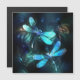 Twee transparante, lichtgevende, turquoise, artistiek getekende libellen op nachtelijke achtergrond met lichtgevende meeralgen en vuurvliegjes. Gloeiende libel.