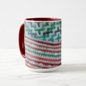 Kleurrijke multi-color gehaakte patronen in helder blauw, groen, maroon, wit, en roze schoppen rond deze mokken. Het originele haakwerk was handgemaakt van liefde. Deze mooie mokken hebben het gevoel van lui warm comfort, allemaal in liefde gewikkeld, en maken prachtige geschenken. Dit afbeelding is een originele foto van JLW_FOTOGRAPHY