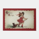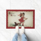 Deze schattige halloween-doormat bevat een afbeelding van Frances Brundage die een klein meisje laat zien dat in een rode jurk zit en dat pet op een bruin rijdt met een schattige zwarte kat voor de rit en de titel die "Halloween Greeting" in een retro-lettertype leest.