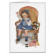kinderafbeelding van een meisje dat dollies naait terwijl ze in een stoel zit.