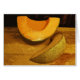 Cette carte de note comporte la photographie de beaux-arts de deux tranches de melons oranges d'or de cantaloup. Ils sont si succulent, le jus peut être vu sur la planche à découper en bois. Les motifs de texture des écorces vertes et jaunes contre l'or et le ton brun apprêtent plus le mur en bois derrière créent une composition abstraite intéressante de couleur et forment. La photographie originale a été numériquement augmentée pour souligner toujours l'humeur globale de cette copie impressionniste et artistique de la vie.
