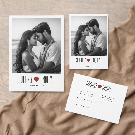 Améliorez votre réception de mariage avec ce menu minimaliste. Doté d'un arrière - plan blanc épuré, de polices de caractères modernes et d'un accent de coeur rouge de bon goût, il présente vos choix de nourriture et de boissons avec élégance et simplicité. Parfait pour les couples qui veulent une expérience culinaire sophistiquée et cohésive pour leurs invités.