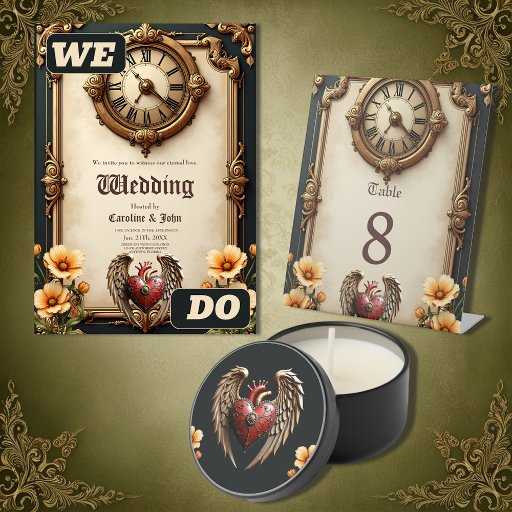 Vintage elegance: an elegant clock and heart. The focal point is a vintage clock with Roman numerals in an elegant gold tone. A winged heart, radiating in vibrant red, is adorned with gold accents that emphasize its contours and lend it a sophisticated shine. The heart's wings are richly detailed, with finely crafted gold feathers that radiate upward, lending the motif a dynamic lightness.