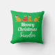 Vun kerstkussen bedrukt met schattige katten in feestelijke kostuums, en de woorden Meowy Kerstmis plus jouw naam van keuze.