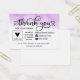 Merci pour votre paquet achat insérer dans un design mignon avec un joli script décoré de coeurs contre un lavage d'aquarelle en violet. Personnalisez avec votre logo d'entreprise et vos comptes de médias sociaux. Vous pouvez également noter un code de réduction pour le prochain achat de vos clients.