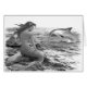 Illustration en noir et blanc d'une jeune sirène assise sur un rocher et observant un dauphin jouer dans l'océan.