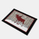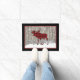 Deze stijlvolle 18 x 24-inch kerstvakantiedoormat heeft een zwarte rand rond een achtergrond van hout, die rood is gesnoeid. Het is voorzien van een grote rode en zwarte gebufferde molen die op sneeuwheuvels staan met witte sneeuwvlokken die achterlopen terwijl de toneelstukken op de woorden van vrolijk kerstfeest worden veranderd in de woorden "Merry Christmoose". Het is zeker dat je een knuffel krijgt van al je gasten over de feestdagen.