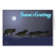 Une froide nuit d'hiver éclairée par la lune ; une meute de loups à l'affût. "Season's Greetings" apparaît en bleu et blanc lumineux.