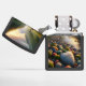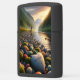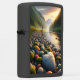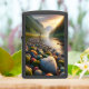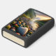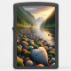 Een hartvormige steen geëtst met de naam Michael rust tussen kleurrijke steentjes door een rustige rivier die bij zonsopgang door een vallei stroomt.