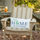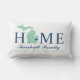 Stijlvolle welkomstkussens bevatten "Home"-tekst met een Michigan-staatskaart en aangepaste tekst die kan worden gepersonaliseerd met uw familienaam en de stad, waar u woont. De hartstedenmarkering kan via Gepersonaliseerd naar de juiste locatie worden verplaatst. Horizontale strepen maken de achterkant omhoog. Blauw van de marine, groen van de jade/van de munt, en witte kleuren.