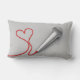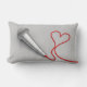 Zilveren microfoon met rode kabel in de vorm van een hart op een grijze achtergrond