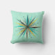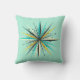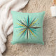 5-sterrenkussen van hoge kwaliteit met een modern atomair Starburst-ontwerp uit het midden van de eeuw in zwart witgoud en blauwgroen op een licht turquoise achtergrond.