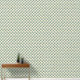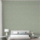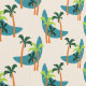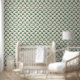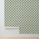 Accent elke kamer met dit behang met een door Mid Century beïnvloed patroon van eenvoudige palmboomgraphics in sinaasappel en groen rond een boemerang gevormde oase of zwembad in een levendig aquablauw. De zandachtergrondkleur kan worden bewerkt.