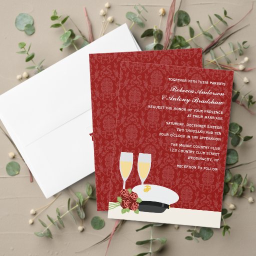 Deze volledig aanpasbare bruiloft uitnodiging is voorzien van een prachtige illustratie van een militaire jurk uniform en een trouwjurk. Aangepaste kleuren beschikbaar op aanvraag. Kunst van Heartlocked Design. Enkele ontwerpelementen © Cocoa Studio