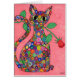 Deze mooie kat zit tegen een zachte roze achtergrond, die haar ingewikkelde, ongebruikelijke markeringen toont, vergelijkbaar met die op millefiori kralen en glas. In haar mond houdt ze een enkele rode roos, in dit unieke, opwindende en zeer gedetailleerde ontwerp.