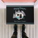 Deze camper thema deurmat staat voor u klaar om te personaliseren met uw eigen naam en groet. Creëer met een schattig mini trailer afbeelding in crème wit en aqua blauw tegen grijs besneeuwde bergen op een zwarte achtergrond. Geweldig cadeau voor huisje of camper families.