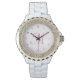 Voeg een vleugje elegantie en glans toe aan uw ensemble met dit prachtige dameshorloge. De witte emaille wijzerplaat is voorzien van minimalistische cijfers en een verfijnd initialen monogram in roze, waardoor een verfijnde en strakke esthetiek ontstaat. Rondom het wijzerplaat zorgen delicate strass-stenen voor een glamoureus accent dat het algehele ontwerp verhoogt. Dit prachtige uurwerk combineert een strakke look met een vleugje glans, waardoor het perfect is voor zowel dagelijkse draag als speciale gelegenheden. Verhoog uw stijl met dit charmante en veelzijdige accessoire.