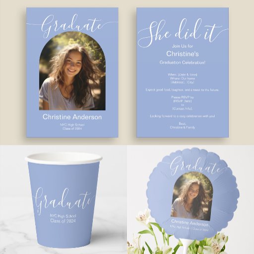 Met zijn strakke vormgeving wordt de focus gelegd op de foto van je afgestudeerde, aangevuld met het prachtige scriptlettertype. Het natuurlijke kleurenschema zorgt ervoor dat de foto de ster blijft, terwijl de achterkant een nette ruimte biedt voor feestdetails, evenals het ingetogen maar toch impactvolle "She did it!"-bericht. Verhoog het afstuderen met deze verfijnde, gepersonaliseerde uitnodigingen die beloven een onvergetelijk stempel op uw gasten te drukken.