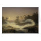 Een mooi kunstmatig afbeelding van meerdere feeën in witte nevel die over water vliegt. Landschapsomgeving met nachtelijke hemel en bos als achtergrond. Schilderen door August Malmstom