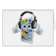 Een mobiele cartoon mascotte met een grote hoofdtelefoon bij het luisteren naar muziek en het geven van een dubbele duim omhoog.
