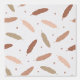 A soothing pattern of soft brown, beige, and tan feathers scattered on a textured white background, accented with small circular details for elegance.