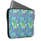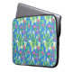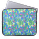 Een sleeve voor een grote laptop, met een patroon van roomwitte Mock Oranje Blossom en helder roze Weigelia op een hemelblauwe achtergrond, met een handbeschilderd waterverf ontwerp van Judy Adamson.