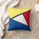 Geïnspireerd door de hedendaagse kunst van de twintigste eeuw, heeft dit kussen duidelijke primaire kleuren van geel, rood en blauw in diagonale blokken en geaccentueerd door zwarte lijnen van verschillende breedtes en een witte achtergrond. De kleuren zijn anders geplaatst op de achterkant.