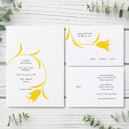 Een gestileerde bloem lijsten huwelijksdetails in dit elegante minimalistische ontwerp.