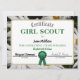 Encadré dans une belle frontière photo de marguerites, ce certificat est pour compléter "x" nombre d'années en scouts pour les jeunes filles. Et c'est un modèle personnalisable. Vous remplissez juste les zones et faites. Au dos, vous avez la possibilité de télécharger une photo memento aussi!