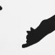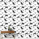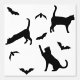 Simple black silhouette pattern of cat and bat silhouettes. One cat is stretching, another is just standing while a third one is reaching toward a flying bat. This design has a modern Halloween aesthetic for those who enjoy a minimal and stylish seasonal look.
