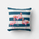 Modern marineblauw wit strepen roze flamingo aangepaste naam gooien kussen.