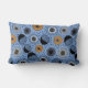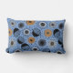 Een opvallend floraal gepatterd ontwerp met een schemerblauwe achtergrond en oranje en bleke roze gepatterde bloemen.