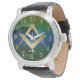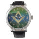Stijlvol gouden vierkant en kompas Masonisch symbool, gepersonaliseerd polshorloge met een moderne fractale achtergrond.